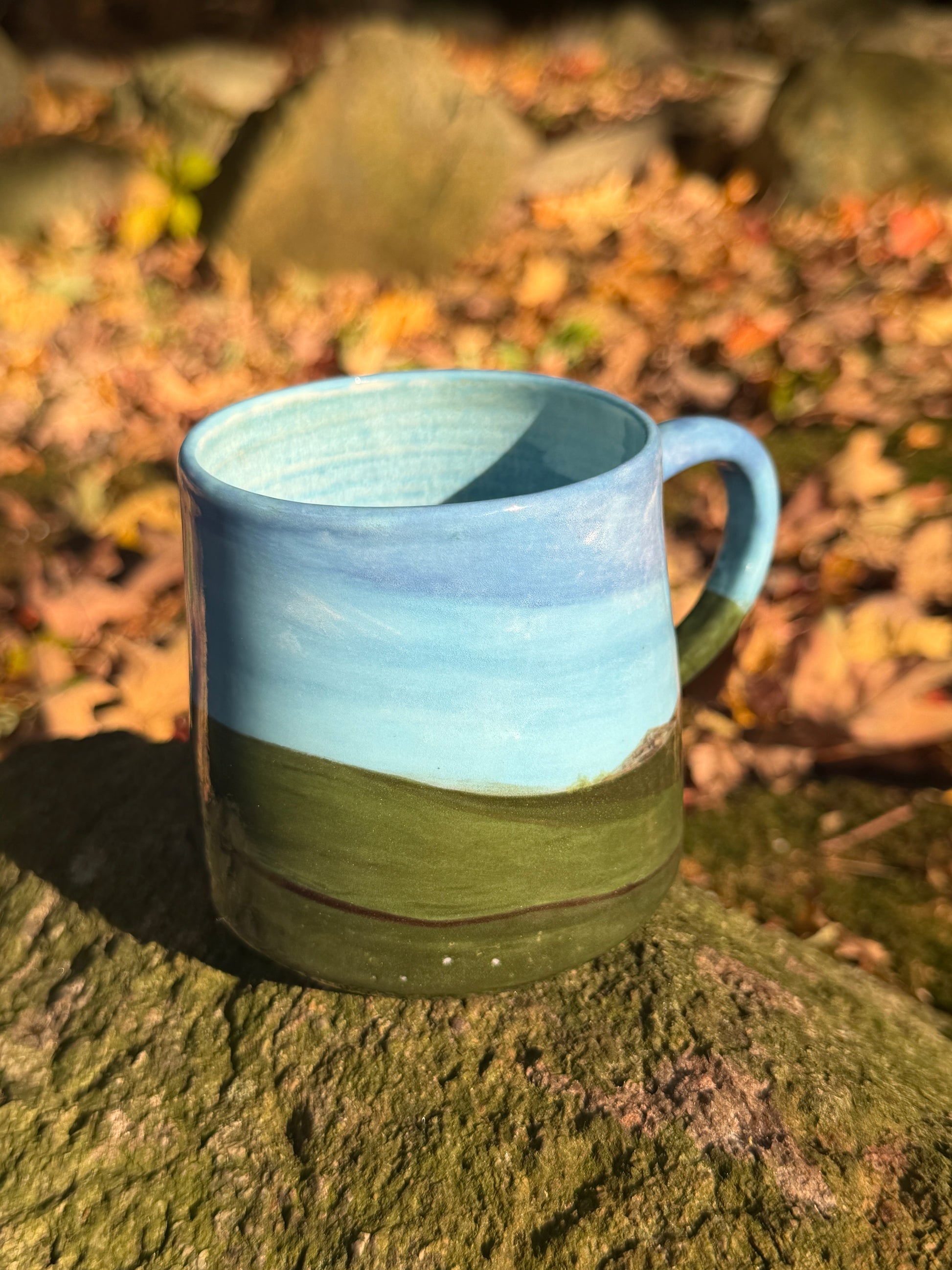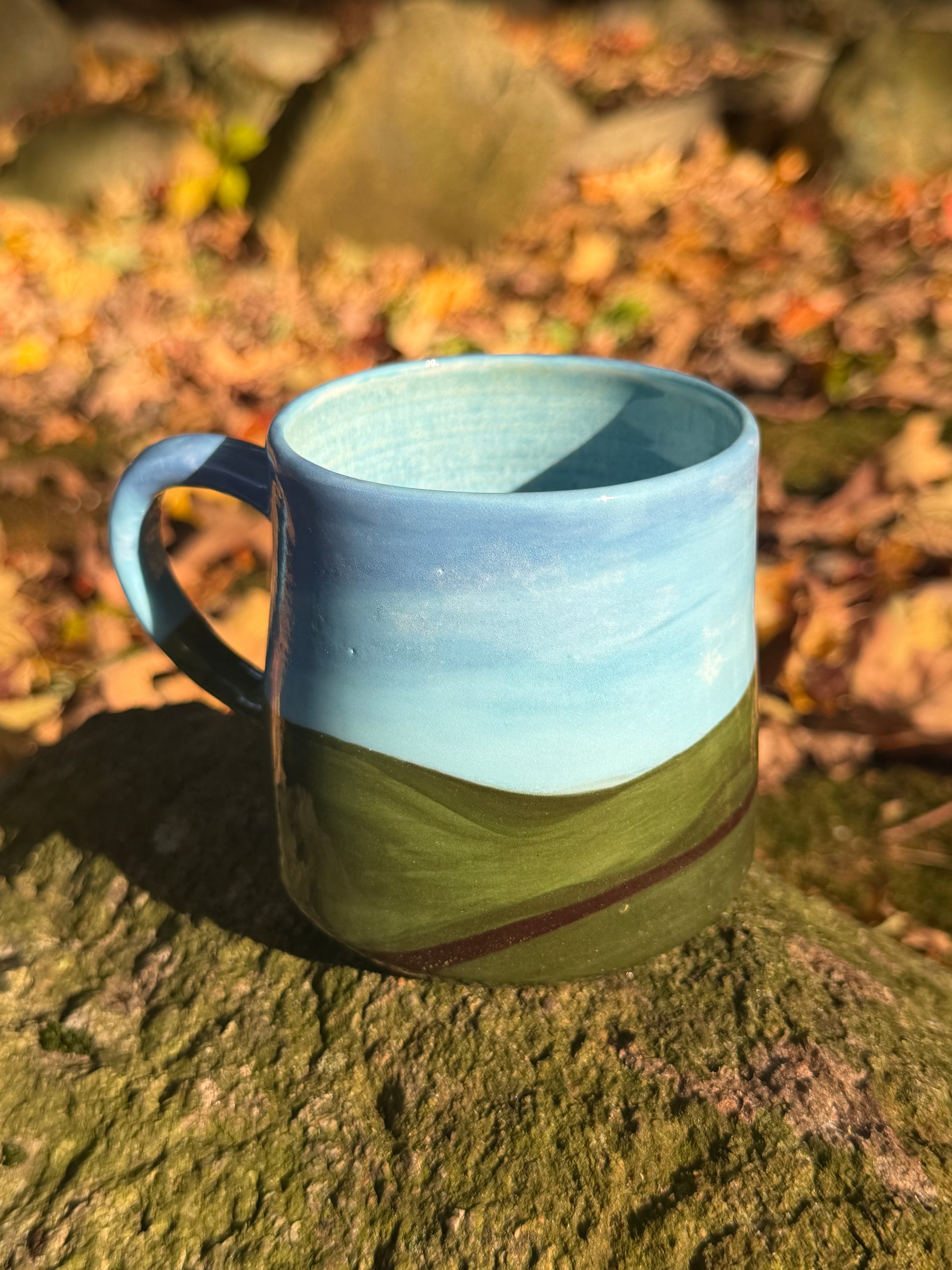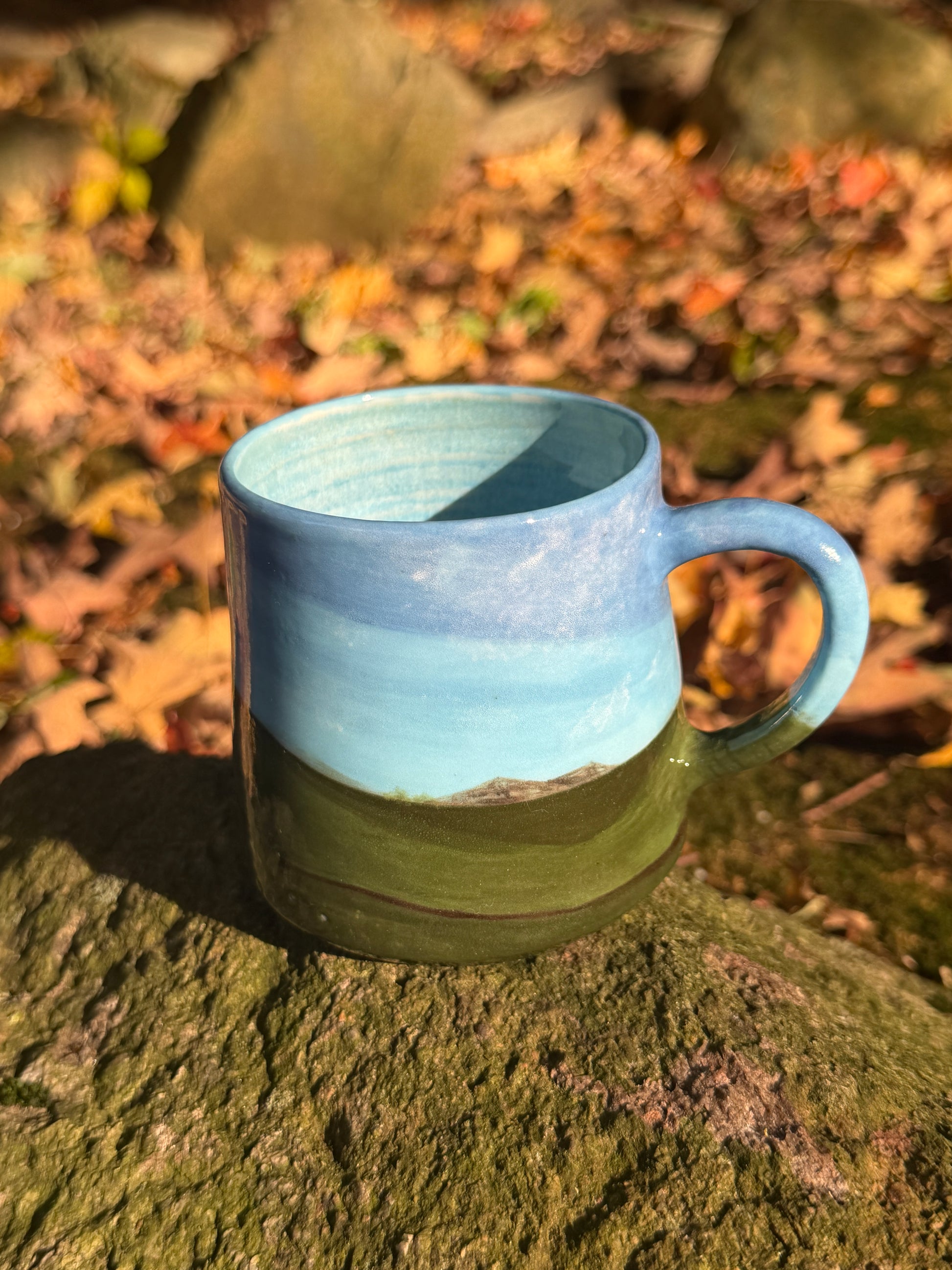 ~10 oz porcelain mug, hand painted á la windows ‘98. Minor glaze imperfections that do not interfere with functionality on exterior.