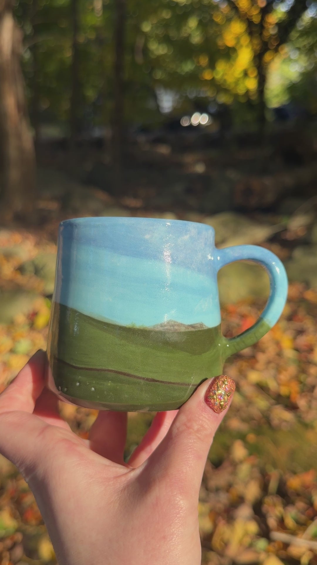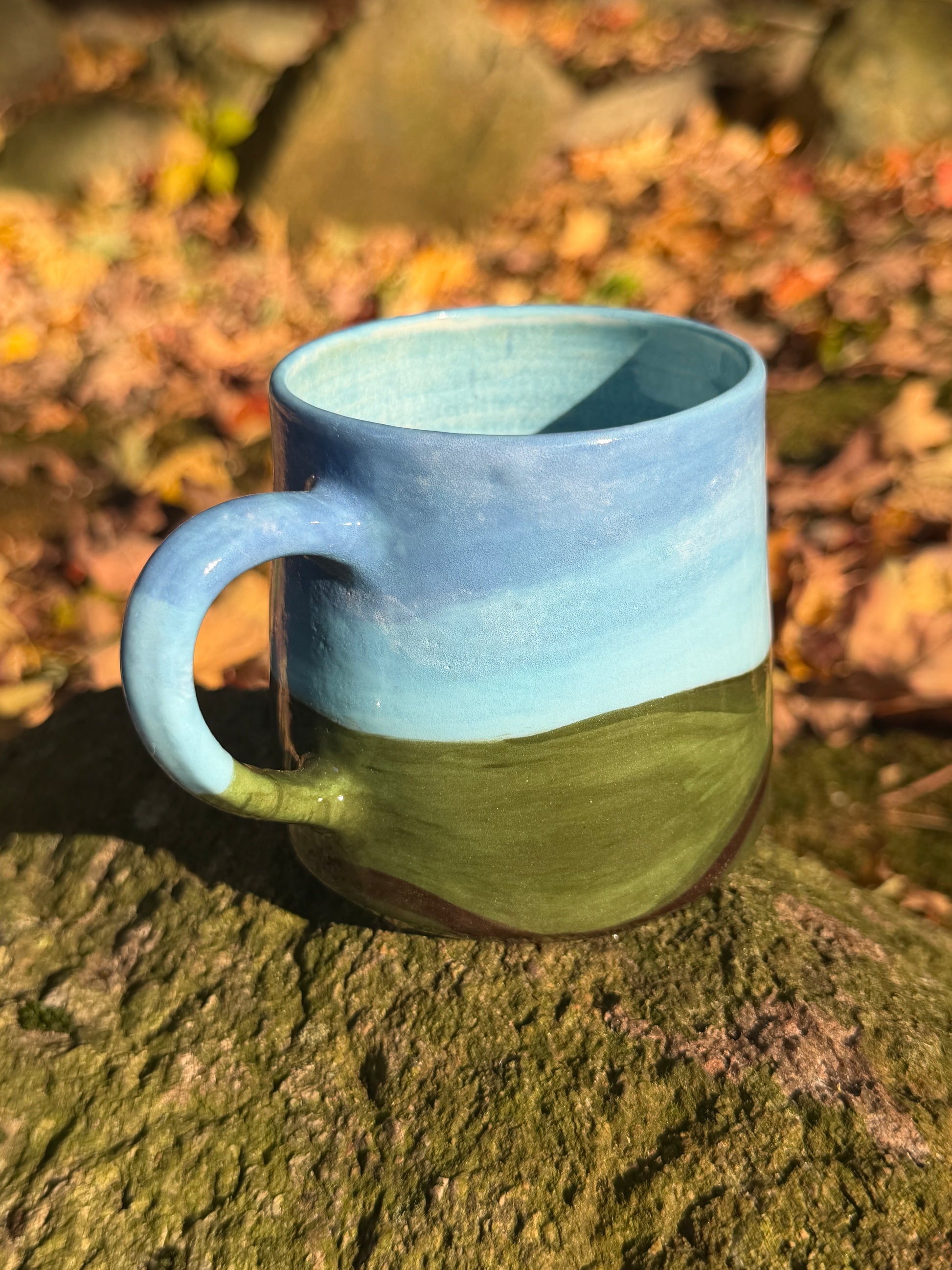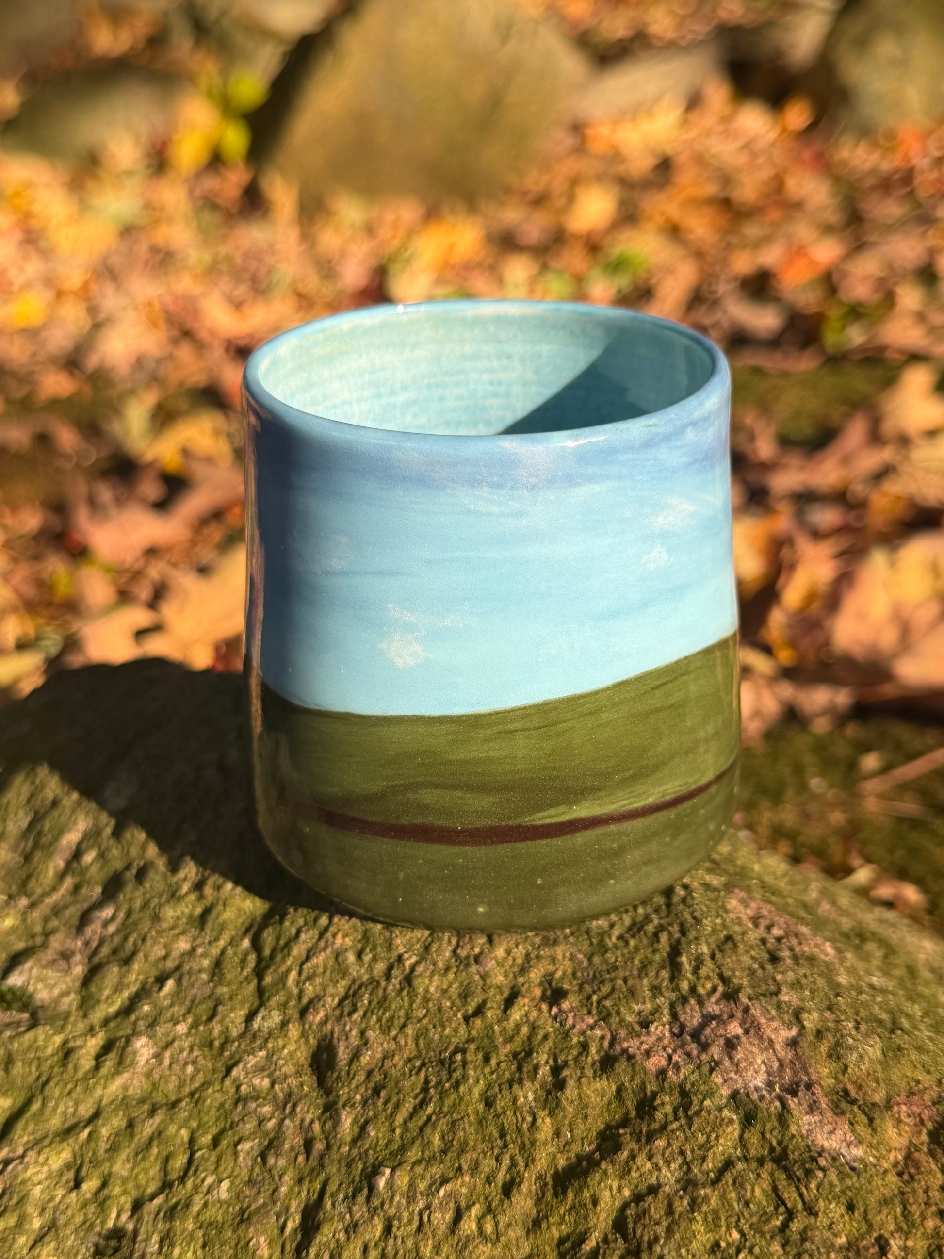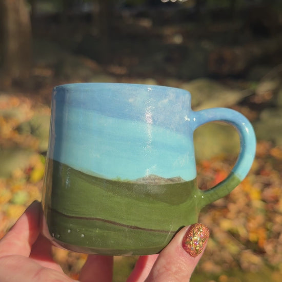 ~10 oz porcelain mug, hand painted á la windows ‘98. Minor glaze imperfections that do not interfere with functionality on exterior.